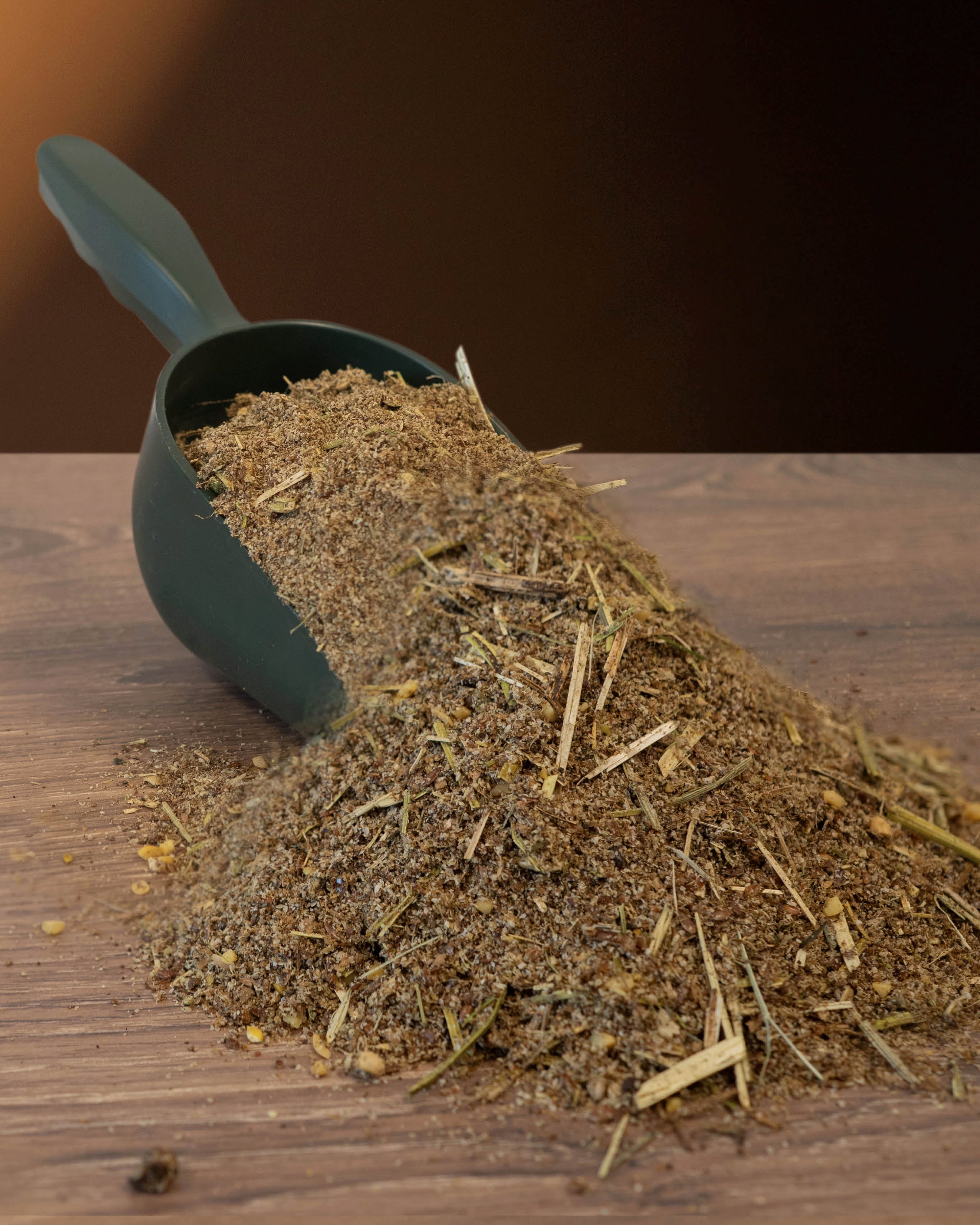 Leinsaat aufgeschlossen, Erbsenschalen, Rapsöl, Johannisbrotschrot, Rapsextraktionsschrotfutter mit Stock aufgeschlossen, Weizenkleie, Sojabohnenflocken getoastet, Apfeltrester, Calciumcarbonat