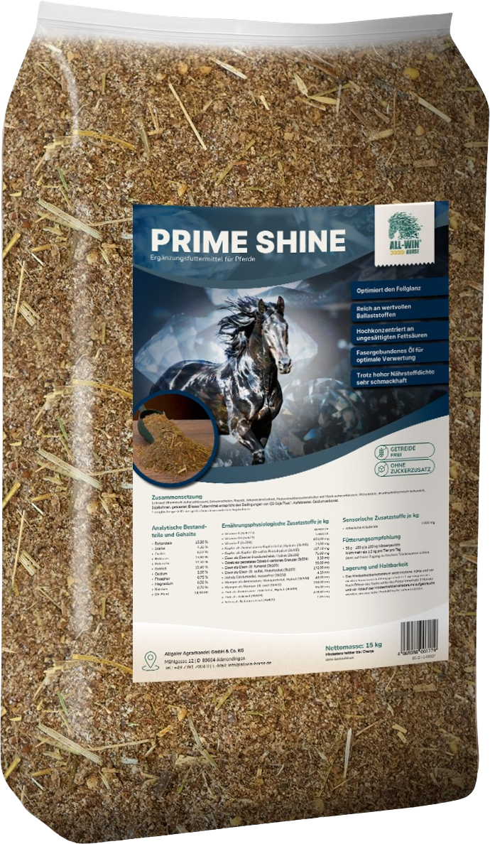 Mit dem ALL-WIN Horse Prime Shine versorgst du dein Pferd gezielt mit hochwertigen Nährstoffen, die zur Unterstützung des Fellglanzes beitragen können. Dieses Ergänzungsfuttermittel ist getreidefrei und kommt ohne Zuckerzusatz aus. Es enthält wertvolle Ballaststoffe und ungesättigte Fettsäuren, die in Verbindung mit fasergebundenem Öl besonders gut verwertet werden. Trotz der hohen Nährstoffdichte bleibt die Rezeptur sehr schmackhaft.