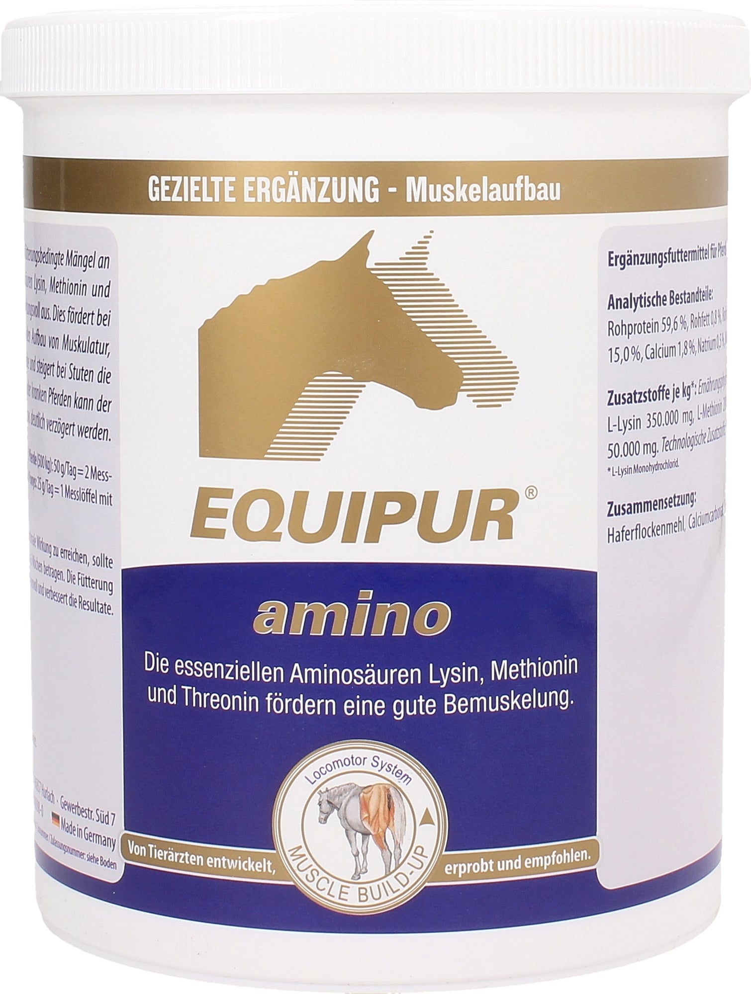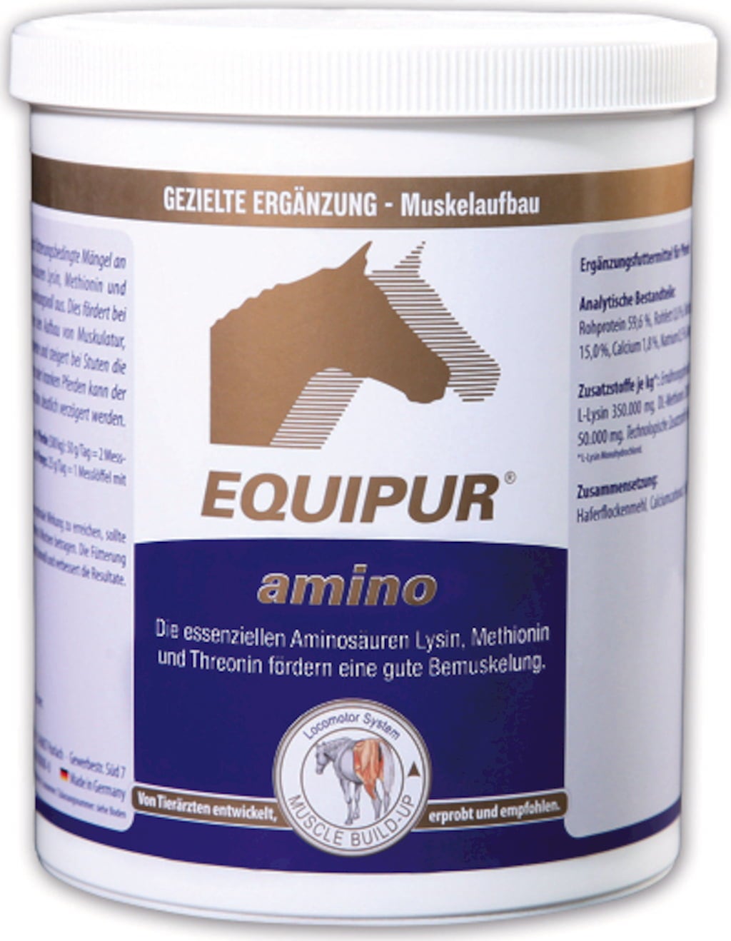EQUIPUR - amino kann fütterungsbedingte Mängel an den essenziellen Aminosäuren Lysin und Methionin sowie dem Mineralstoff Calcium ausgleichen. Es unterstützt besonders bei Sportpferden, Fohlen sowie älteren Pferden den normalen Aufbau von Muskulatur, Knochen und Bindegewebe. Bei Stuten kann es die Milchleistung unterstützen.