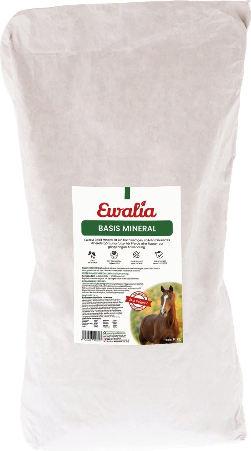 Das hochwertige Mineralergänzungsfutter ist vollvitaminisiert und die ideale Ergänzung für alle Pferderassen. Dank der zuckerarmen Rezeptur ist es auch für stoffwechselempfindliche Pferde geeignet. Eine bedarfsgerechte Versorgung mit allen wichtigen Mineralstoffe und Vitaminen ist in vielen Fällen nicht ausreichend gewährleistet. Daher ist einer Ergänzung mit dem Ewalia Basis Mineral sinnvoll, um einem Nährstoffmangel entgegen zu wirken.