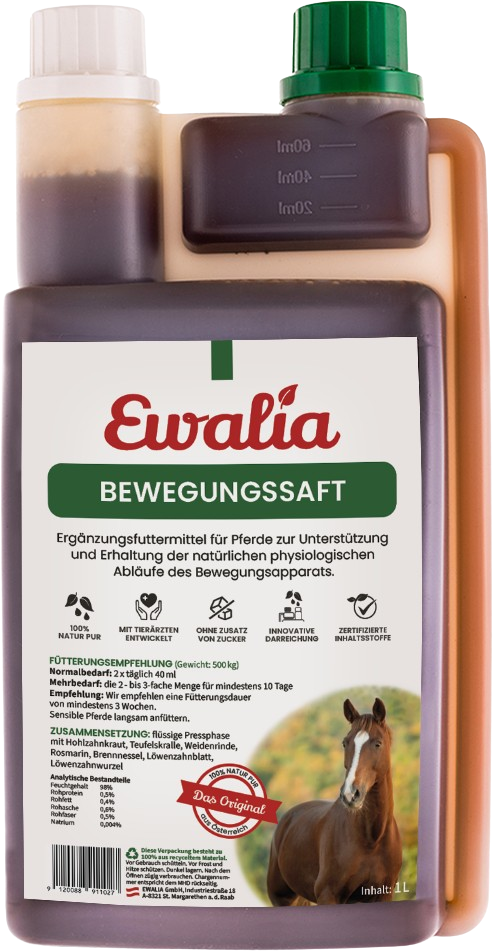 Einwandfreie physiologische Abläufe tragen erheblich zum allgemeinen Wohlbefinden deines Pferdes bei. Um den Bewegungsapparat bestmöglich zu unterstützen, kann der Bewegungssaft von Ewalia zur täglichen Futterration beigemengt werden. Hier finden nur erlesene Kräuter und Pflanzenteile ihren Platz. Unter anderem tragen Brennnessel-, Rosmarin- und Löwenzahnblätter zur Beweglichkeit bei, abgerundet von Teufelskralle und Weidenrinde.