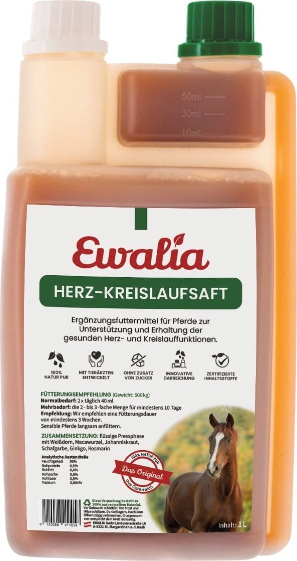 Die natürliche Funktion von Herz-Kreislauf kann durch dieses Ergänzungsfuttermittel unterstützt werden. Der Kräutersaft eignet sich zur Fütterung vor Wetterumschwüngen, Hitzewellen, Temperaturschwankungen, großer Anstrengung sowie bei Leistungsschwäche und älteren Pferden.