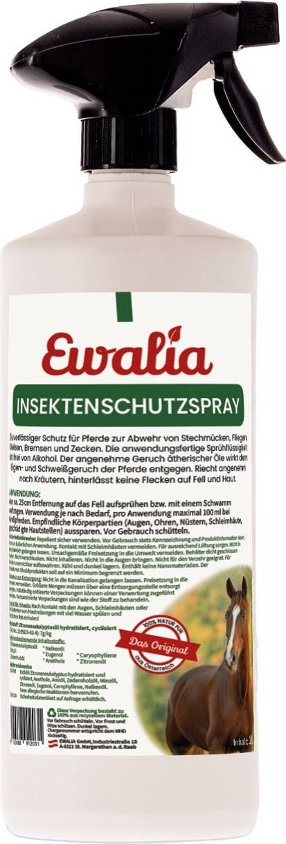 Der EWALIA Insektenschutz-Spray ist ein zuverlässiger und chemiefreier Schutz für Pferde vor Fliegen, Gelsen, Steckmücken, Bremsen und Zecken. Es kann je nach Bedarf aufgetragen werden. Augen und Nüstern aussparen. Der Spray duftet sehr angenehm und hält Insekten zuverlässig fern.