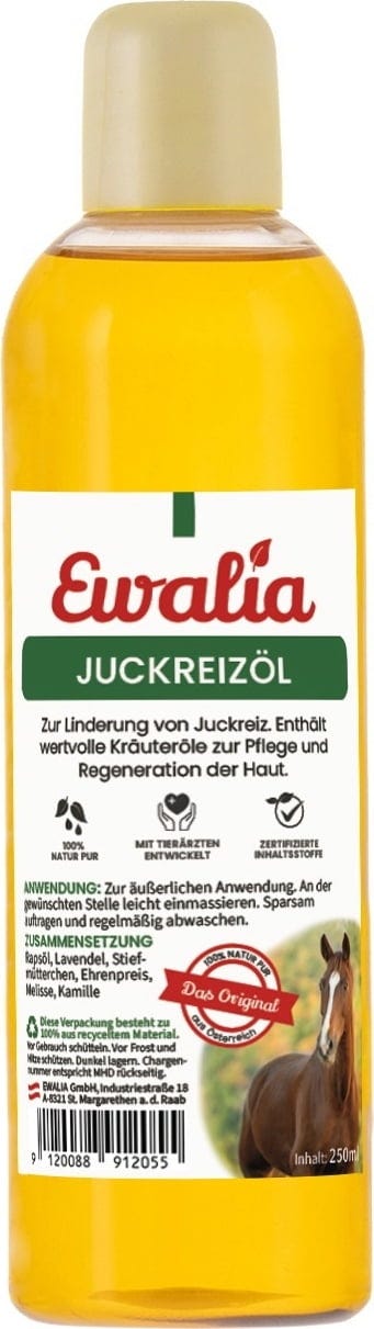 Das EWALIA Juckreizöl für Pferde ist zur Linderung von Juckreiz geeignet. Das Öl enthält wertvolle Kräuter zur Pflege & Regeneration der Haut sowie zur gezielten Mücken- und Insektenabwehr.