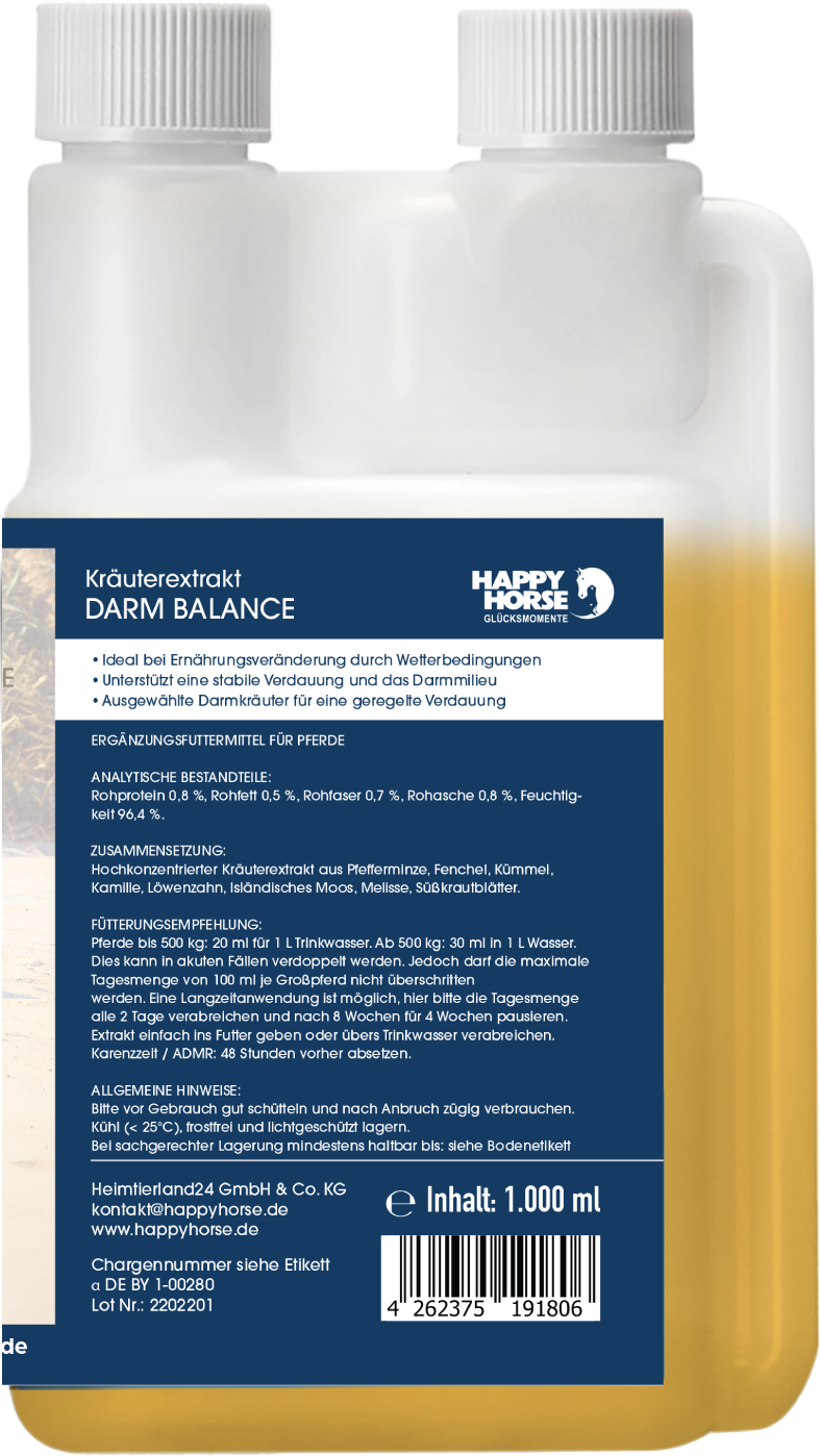 Mit einer sorgfältig zusammengestellten Kräutermischung wurde das Darm Balance Liquid zur Unterstützung eines empfindlichen Magen-Darm-Trakts konzipiert. Kräuter und Pflanzenstoffe, wie Fenchel, Pfefferminze, Löwenzahn und Kümmel, sowie Isländisches Moos, Kamille und Melisse, werden kombiniert. Gerade in Zeiten von Wetterumschwüngen und Temperaturschwankungen greifen Pferdebesitzer:innen gerne auf die bewährte Formel zurück.