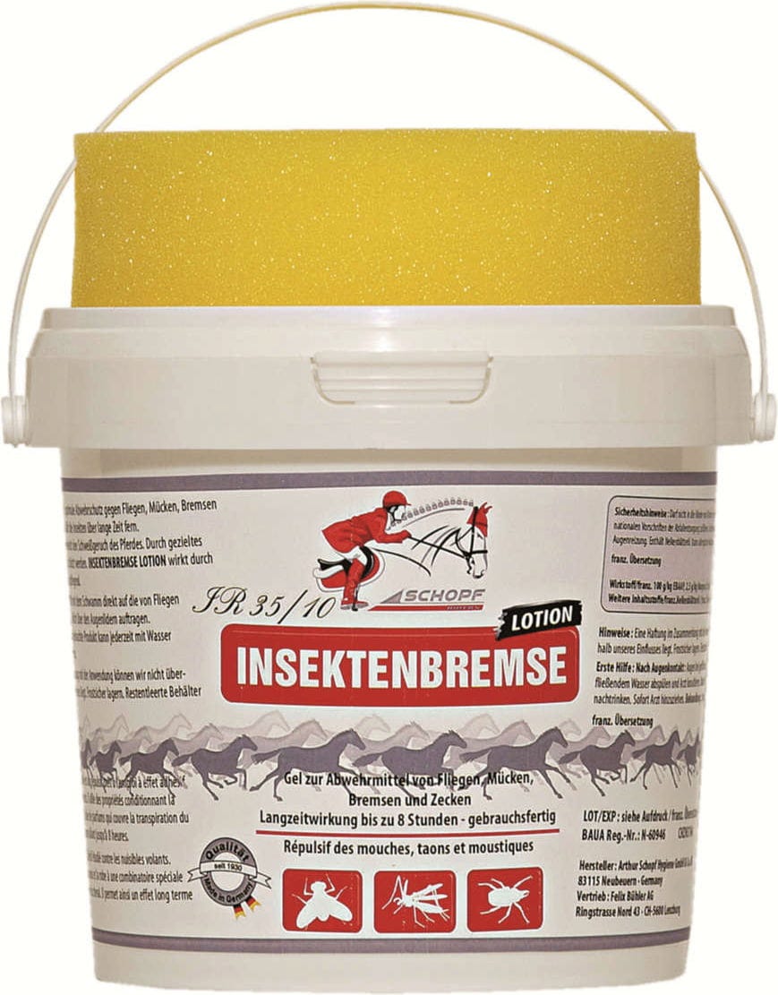IR 35/10 Insektenbremse-Lotion ist ein gebrauchsfertiges, speziell haftendes Abwehrmittel gegen fliegendes Ungeziefer. Mit seinen haut- und fellpflegenden Eigenschaften und durch ausgewählte Kompositionen überdeckt es den Schweißgeruch des Pferdes.