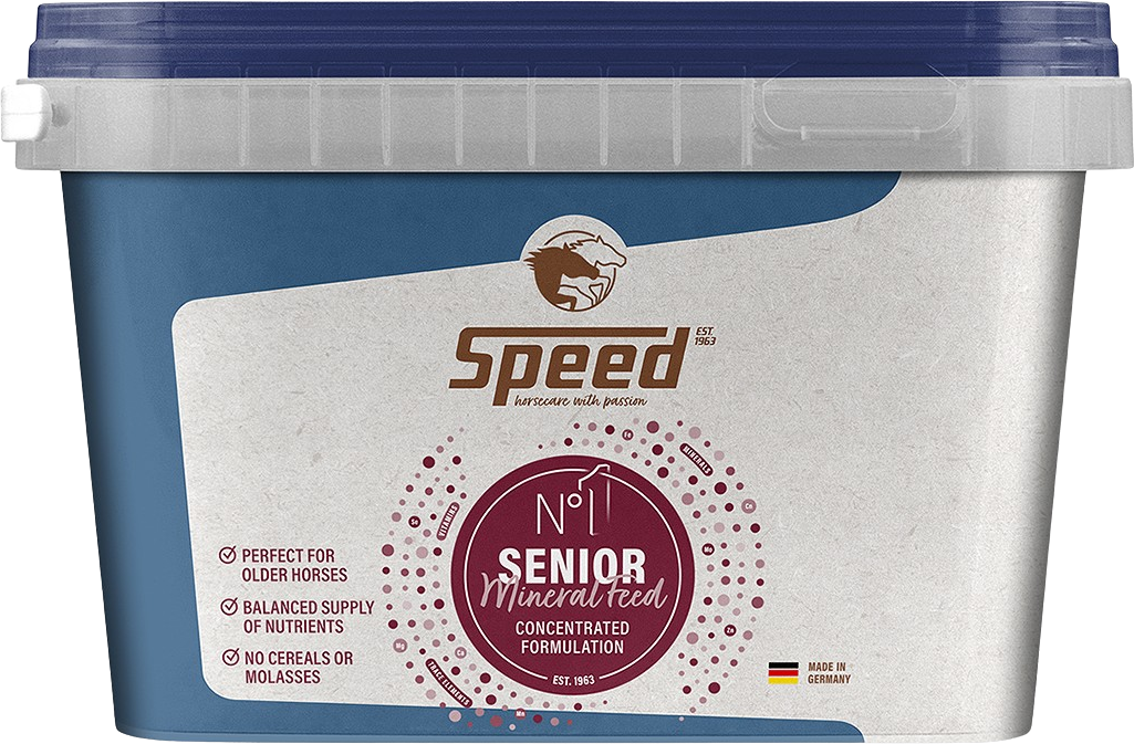 SPEED N°1 Senior wurde speziell für die Mineralstoffversorgung älterer Pferde konzipiert. Dank organisch gebundener Spurenelemente und essentieller Vitamine werden Stoffwechsel und Immunsystem sanft unterstützt. Spirulina-Alge liefert wertvolle Aminosäuren und Traubenkernmehl natürliche Antioxidantien, welche beide zur Unterstützung des Muskelerhalts beitragen können. Der erhöhte Calcium-Gehalt unterstützt Knochen und Zähne.