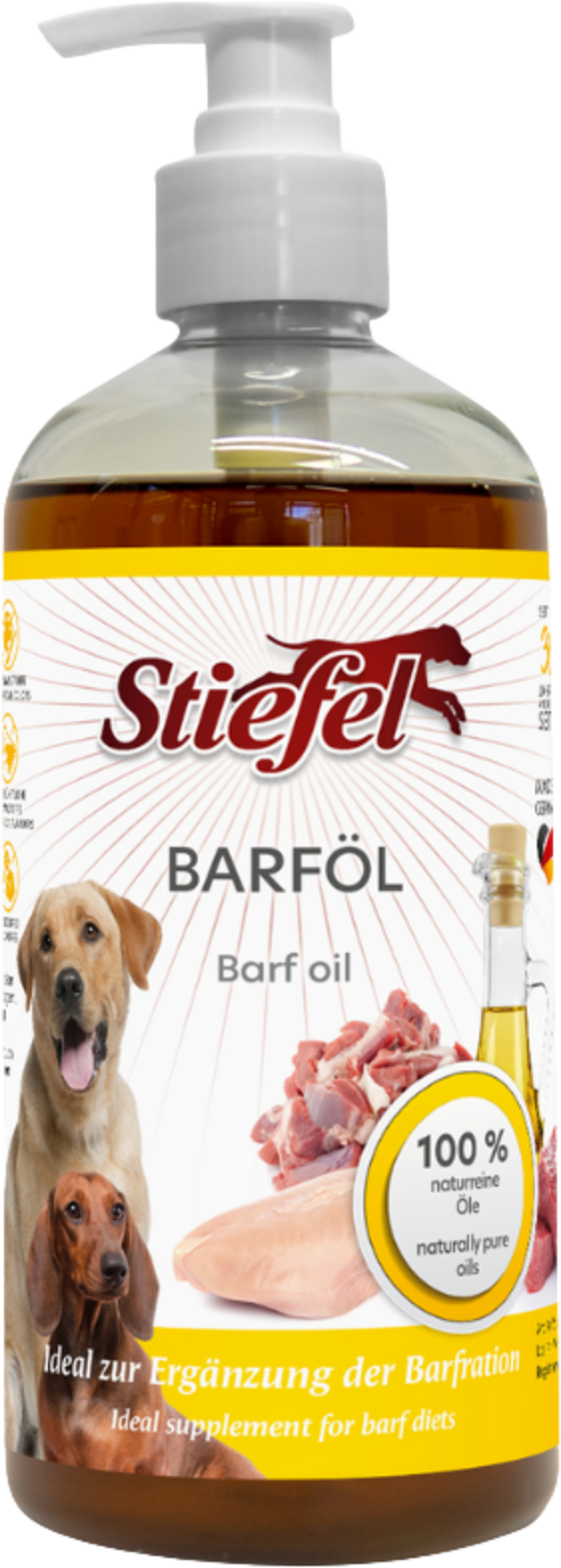 Stiefel Barföl ist eine hochwertige Mischung aus einer Komposition nährstoffreicher Öle zur Ergänzung der täglichen Barfration. Stiefel Barföl kann als Ergänzung zu einer ausgewogenen Ernährung beitragen.
