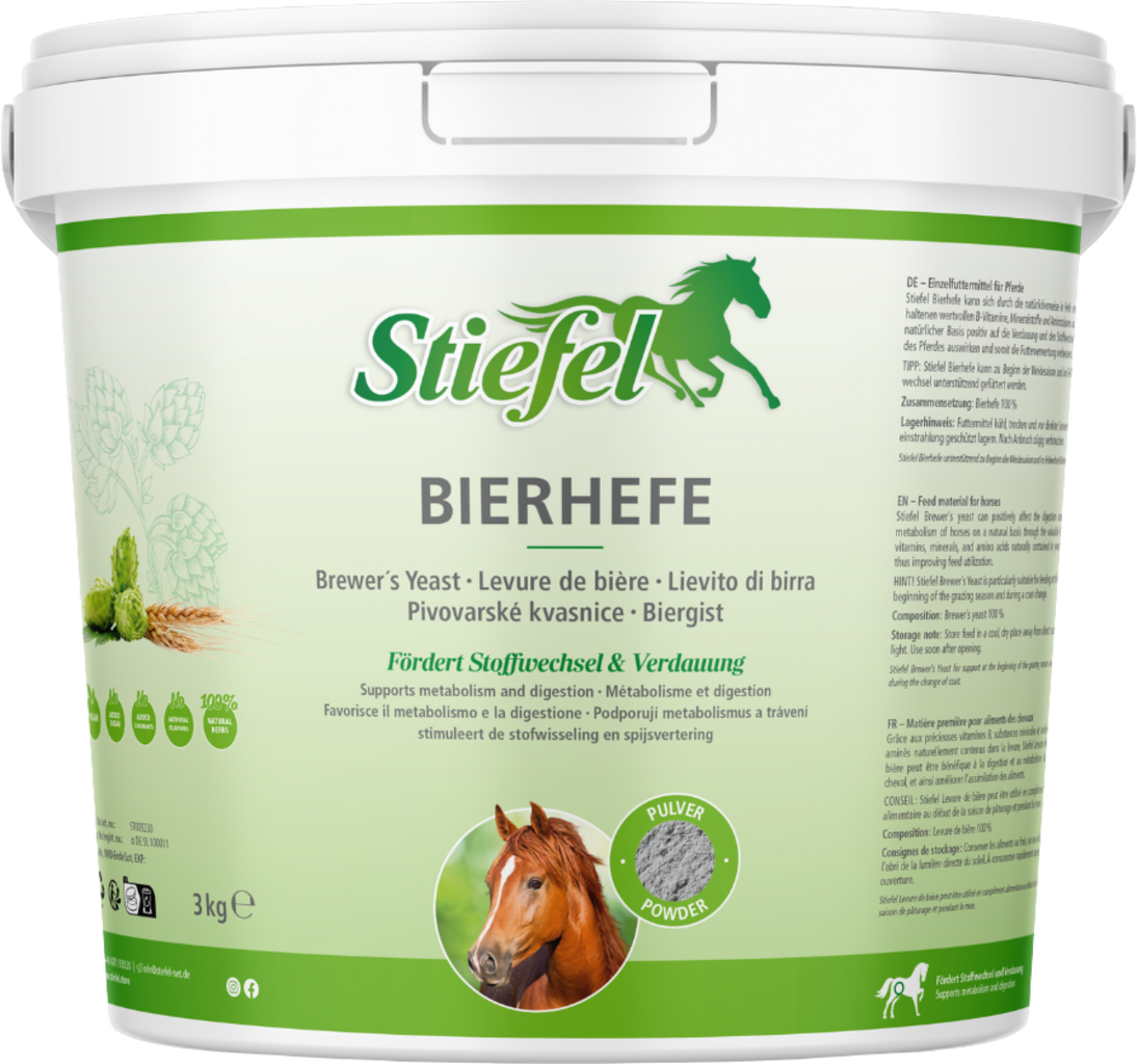 Stiefel Bierhefe kann sich durch die natürlicherweise in Hefe enthaltenen wertvollen B-Vitamine, Mineralstoffe und Aminosäuren auf natürlicher Basis positiv auf die Verdauung und den Stoffwechsel des Pferdes auswirken und somit die Futterverwertung verbessern.
