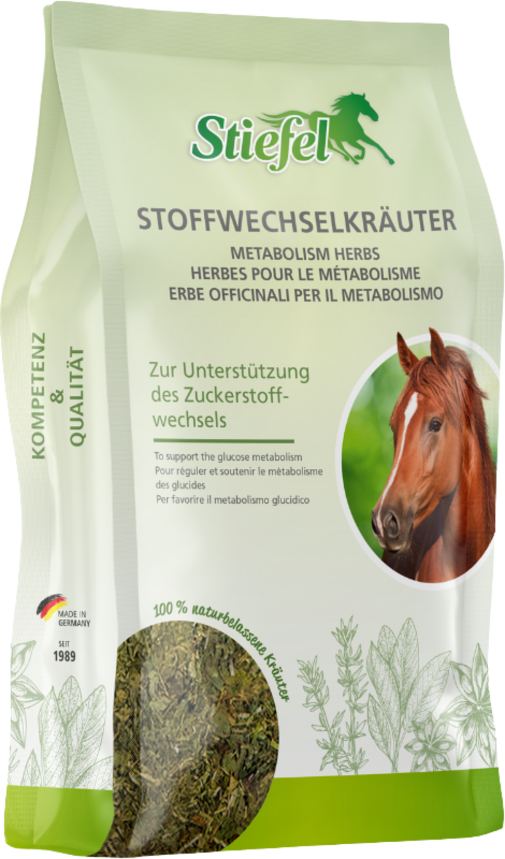 Stiefel Stoffwechselkräuter sind eine speziell ausgewählte, naturbelassene Kräutermischung zur Unterstützung des Zuckerstoffwechsels beim Pferd. Die Kräutermischung kann den Stoffwechsel von Kohlenhydraten, insbesondere die Verwertung von Zucker, optimieren.