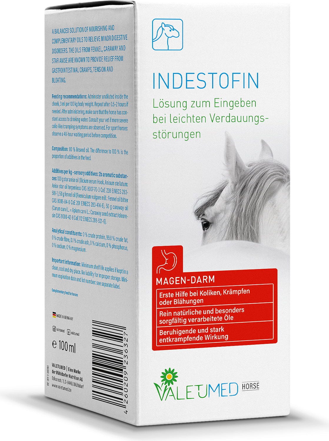 Valetumed Indestofin ist eine abgestimmte Ölmischung, die aus Fenchel-, Lein-, Kümmel- und Sternanisöl besteht. Diese naturreine Komposition wurde gezielt entwickelt, um den Magen-Darm-Trakt deines Pferdes ernährungsphysiologisch zu begleiten.