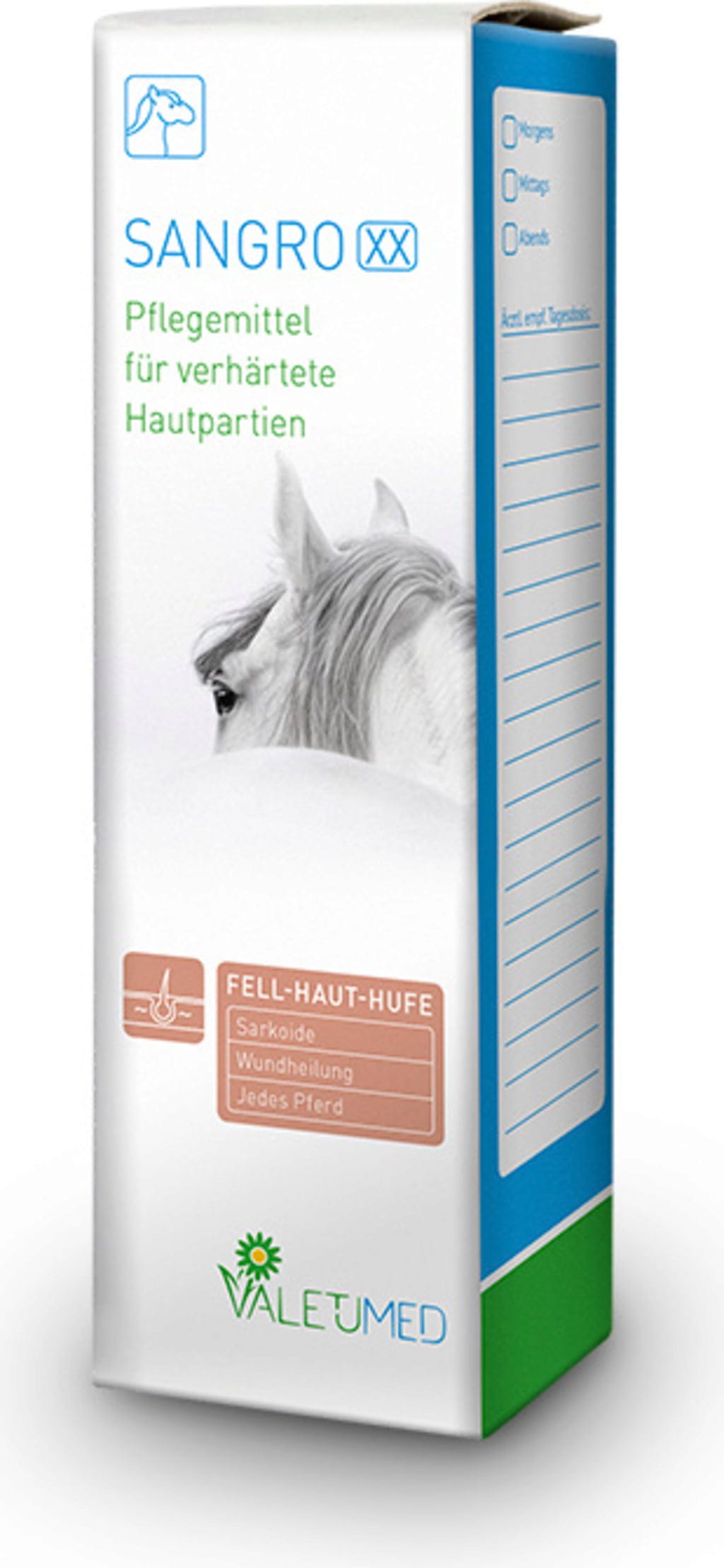 Valetumed Sangro XX ist ein spezielles Hautpflege-Gel für Pferde. Die Formulierung aus einer Komposition verschiedener Pflanzenextrakte und Mikrosilber wurde entwickelt, um beanspruchte Hautpartien pflegend zu begleiten.