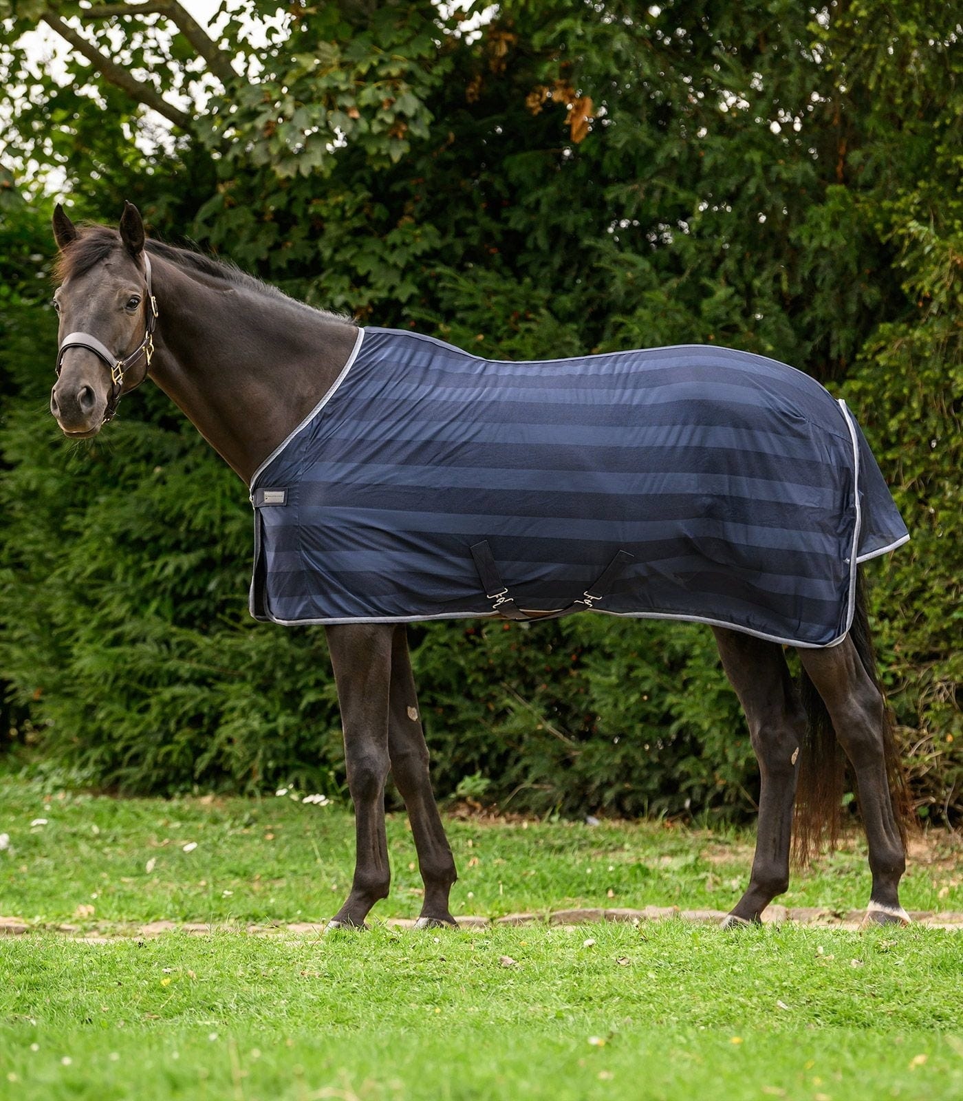 Die in dezenten Farben gehaltene, gestreifte Fliegendecke bietet Pferden einen klassischen und effektiven Schutz vor lästigen Insekten. Hergestellt aus hochwertigem 100 % Polyester-Material, gewährleistet sie Langlebigkeit und Komfort. Ihr edles Design wird durch den praktischen Frontverschluss und die stabilen Kreuzgurte ergänzt, die eine sichere und individuelle Passform ermöglichen.